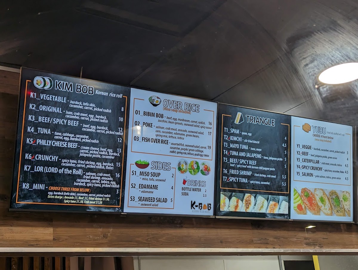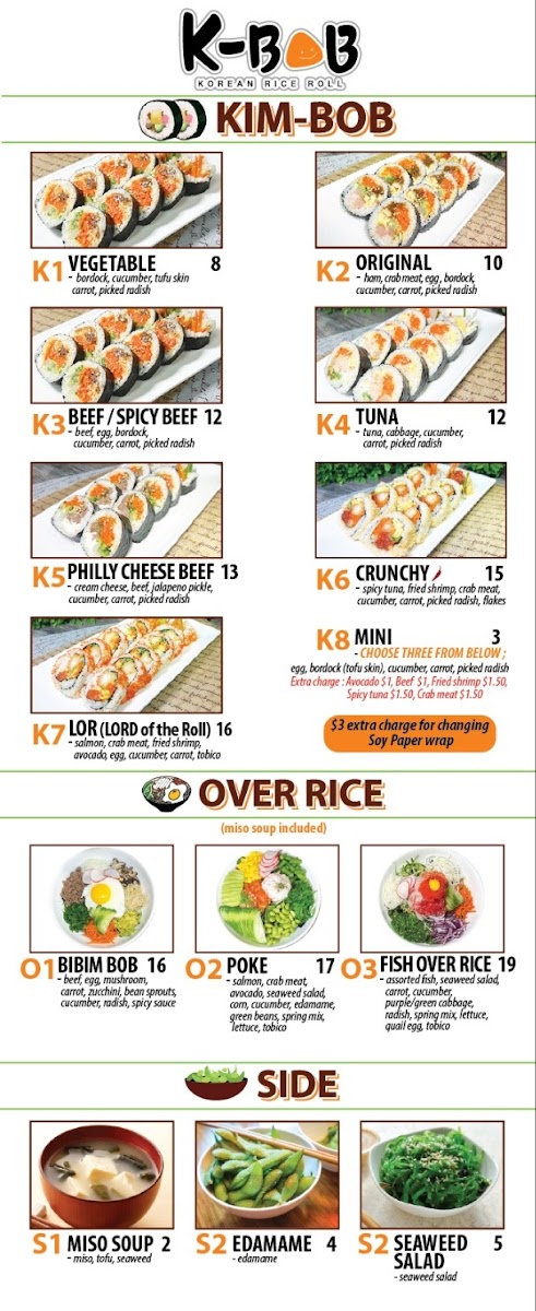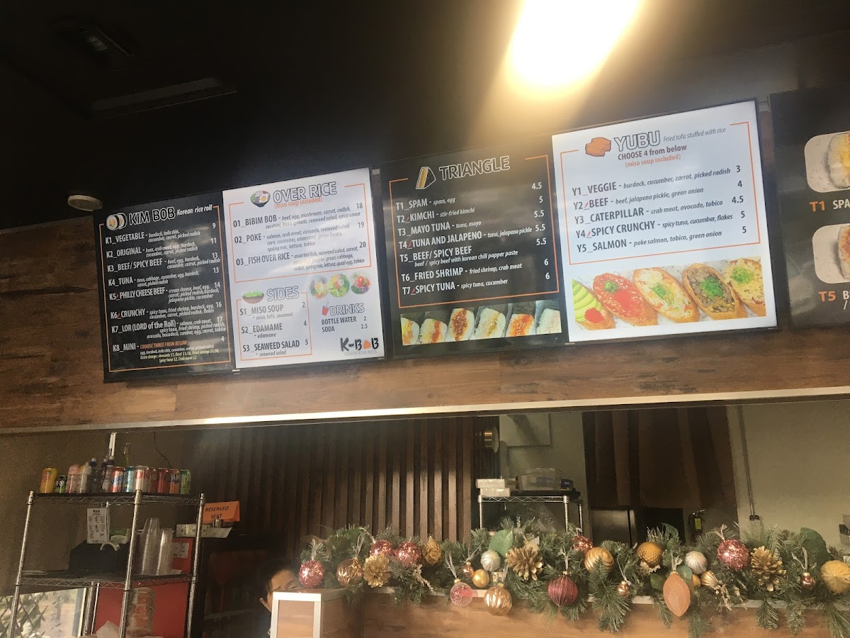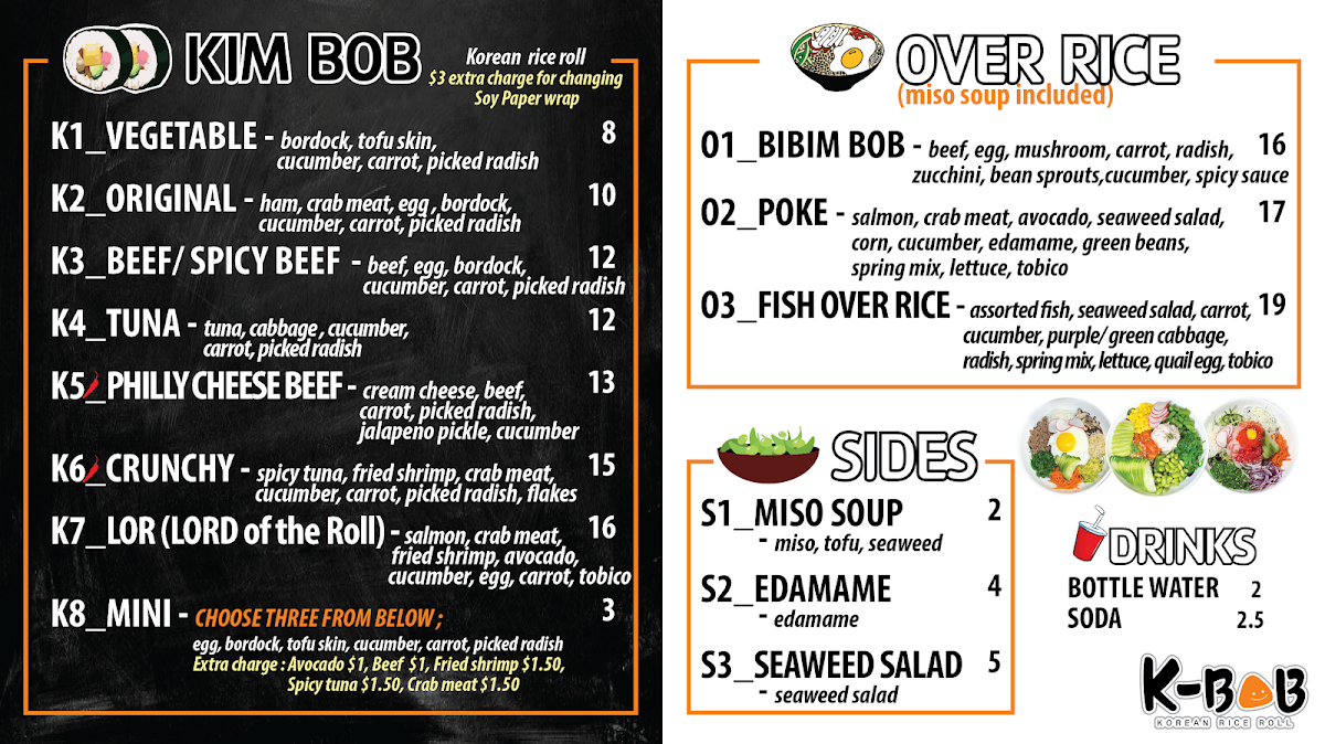 K-BOB specializes in Korean cuisine, offering a variety of dishes that are sure to tantalize your taste buds. The menu features an impressive selection of kimbap (Korean rice rolls) and hearty rice bowls that are both flavorful and filling. Popular highlights include: